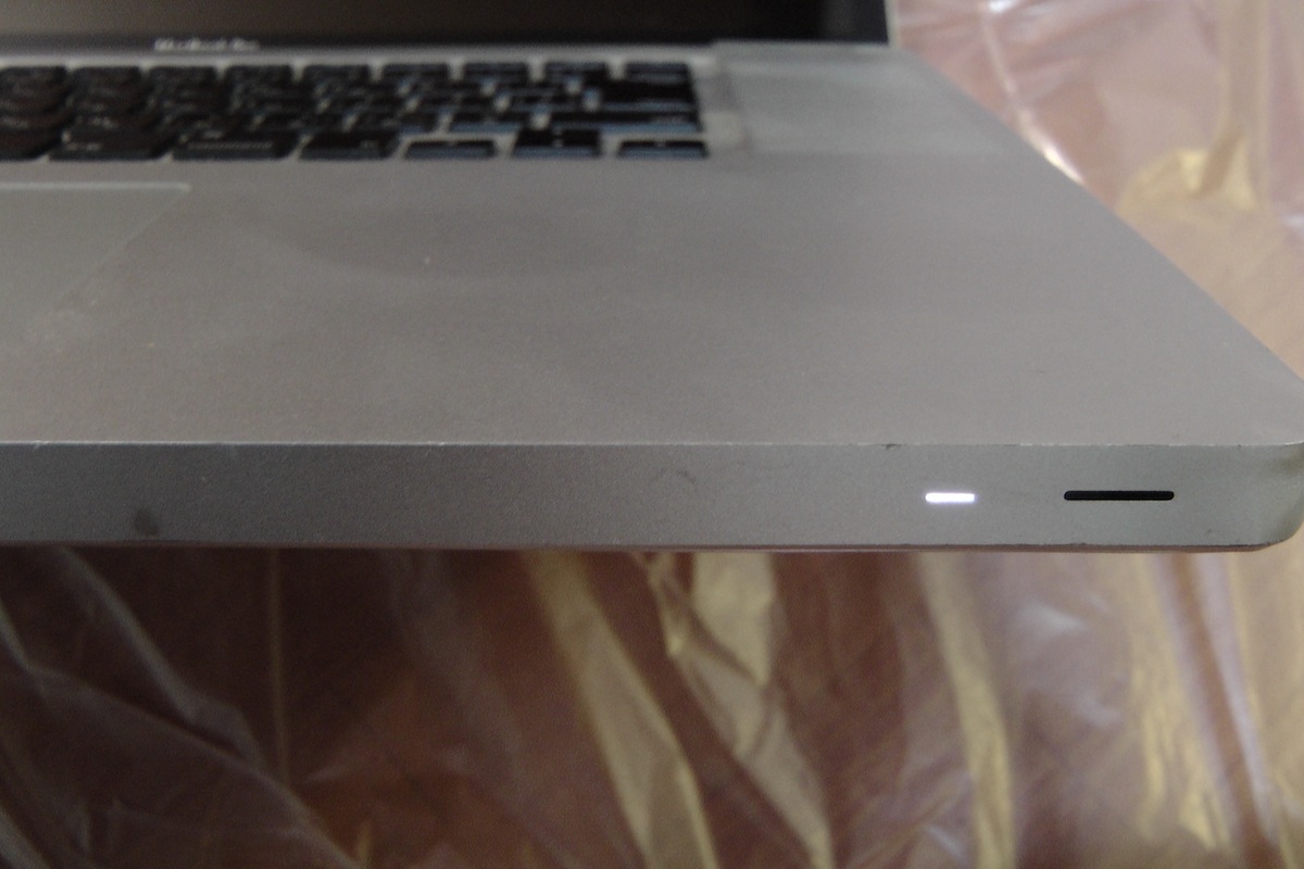 まずMacごとゴミ袋に入れ、シールでふたをします。床にもゴミ袋を敷き、準備万端。大きな荒目のヤスリで削っていきます。10往復くらいすれば十分に削れます。