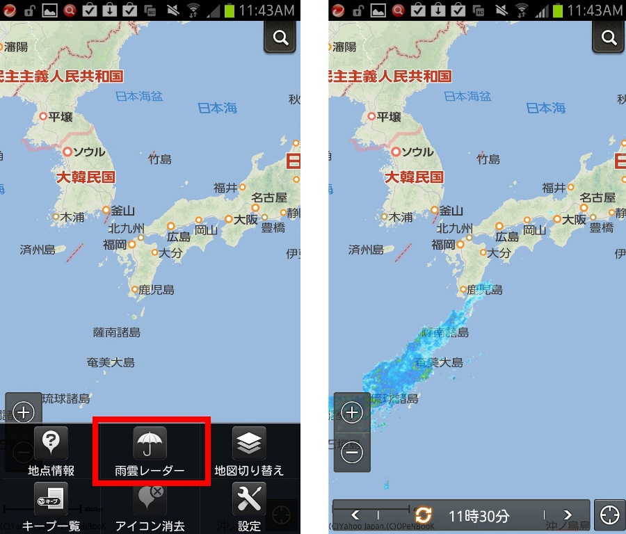 今回はウェブ版のほか、「Yahoo!ロコ 地図」のAndroidアプリからもこの雨雲ズームレーダーにアクセスできます。Yahoo!ロコはGoogle Play(こちら)からダウンロード可能です。