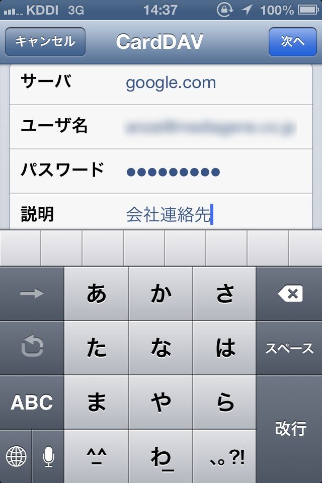 サーバには「google.com」、ユーザ名・パスワードには自分の使っているGoogleアカウントのメールアドレス、説明には任意で連絡先の名前(「私用」、「A株式会社」など)を入力します。