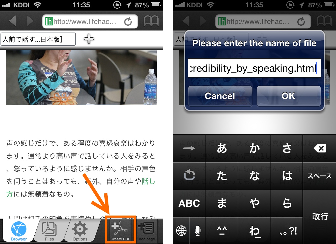 ページをPDF化するのは簡単。画面下部のPDFタブを押すだけです。保存ファイル名を入力すれば完了です。
